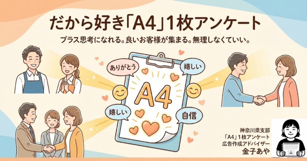 私はアドバイザーをするほどこのアンケートが大好きなんですが、今日は、なぜ私がここまで「A4」1枚アンケートを好きなのか、その理由をお伝えしたいと思います。