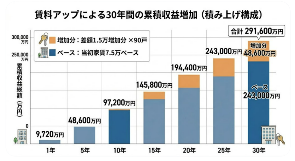 ▶賃貸マンション 90室で当初計画家賃7.5万⇒修正家賃9万⇒月額135万の差額(1室当り1.5万)