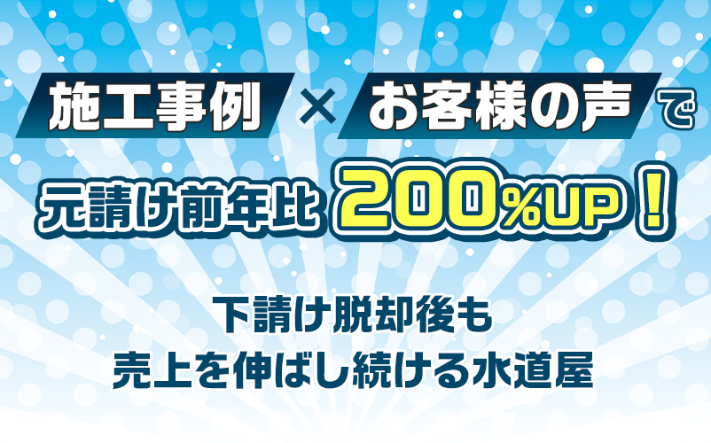個人の問い合せ前年比200%増 うち、WEBは50%(∔約700万円) 受注率90% 思い切って下請けを辞めても売上は増え続けている。