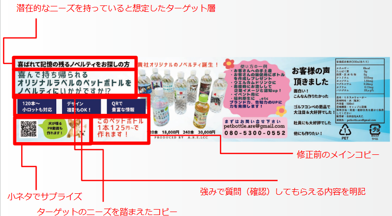 そんな中、小ロットによるペットボトルラベルノベルティは「知らない」商品だったため、告知、宣伝が難しく定期的な受注獲得につながる企業への認知対策の必要に迫られた。