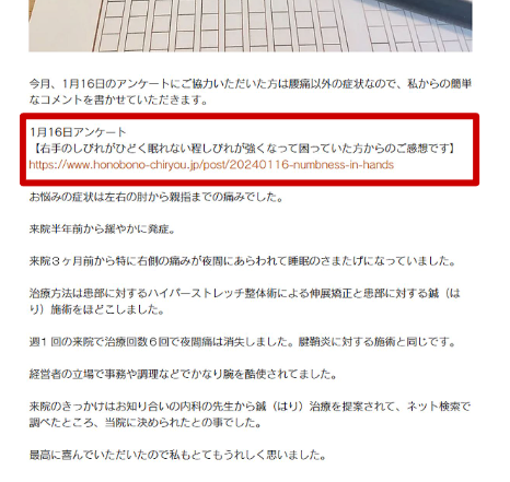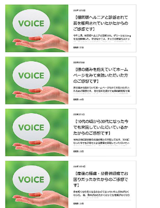 アンケートを長期に渡って取り続け、とても喜んでいただいた事例を掲載することで、ホームページ構築初期とは違って、痛みについて深い悩みを抱えたかたの来院が増えた。また、そのかたが治ることによって困っているかたを紹介していただけるという好循環が継続している。